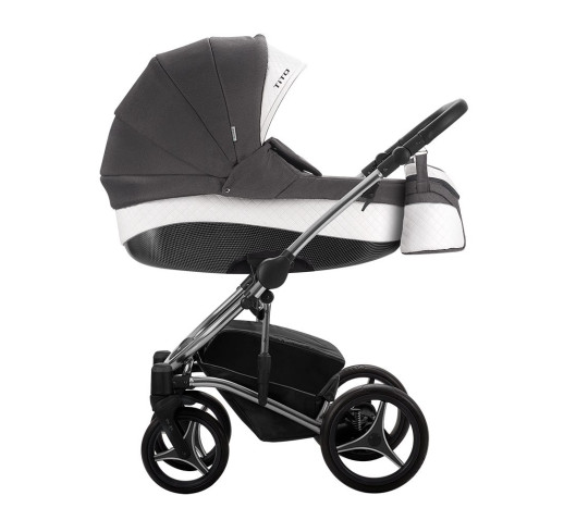TITO Premium Class отличается комбинацией текстильных фактурных материалов и эко-кожи для обивки. Элегантный дизайн подчеркивается использованием глянцевого хромированного шасси, а также днища люльки из высокотехнологичного пластика «под карбон» и стильных дисков колес.