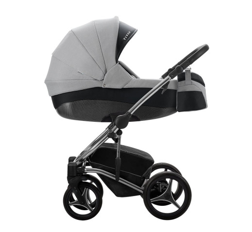 TITO Premium Class отличается комбинацией текстильных фактурных материалов и эко-кожи для обивки. Элегантный дизайн подчеркивается использованием глянцевого хромированного шасси, а также днища люльки из высокотехнологичного пластика «под карбон» и стильных дисков колес.